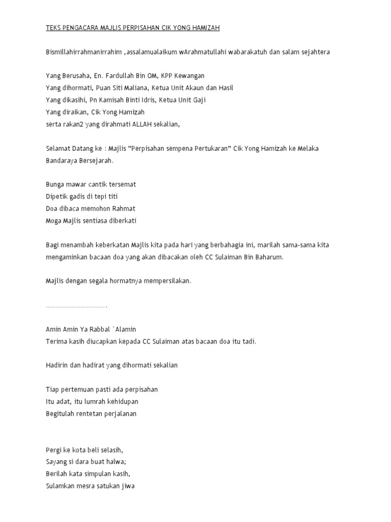 Pada majlis perpisahan sekolah, terutamanya sekolah rendah darjah 6, biasanya pelajar ditugaskan untuk membuat teks ucapan perpisahan untuk dipamerkan pada majlis perpisahan kemudian. Majlis persaraan pegawai pendidikan merupakan sebahagian tatacara operasi piawai atau s.o.p. Teks ucapan persaraan tn hj badaruddin hj dahlan. Dijemput en jasni bin sahid selaku ketua dan wakil pembantu makmal untuk menuyampaikan ucapan, dipersilakan. Contoh teks pengacaraan majlis formal. Yang diraikan tuan haji abdullah bin mohd. Mengumumkan ketibaan yang diraikan en. Contoh farewell speech (ucapan/pidato perpisahan). Majlis perpisahan persaraan saya dengan rasminya telah dibuat oleh pihak sekolah menengah kebangsaan sultan ibrahin satu, 17000 pasir mas, kelantan pada 28 februari, 2013 ( khamis ), bertempat di dewan besar sekolah yang bermula pada jam 12.00 tengah hari hingga jam 2.00 petang. Kita doakan hingga ke akhirnya. Sqamsuki bin sudin atas ucapan itu tadi. Contoh ucapan hari lahir, hari jadi, takziah, guru, perkahwinan, perpisahan, penghargaan, tahniah, doa selepas solat. 1472 hits video ucapan perpisahan rakan sekerja yang pindah tugas ke tempat lain ini adalah contoh ucapan perpisahan kerja jika anda wakil pekerja nak buat ucapan perpisahan untuk kawan sekerja yang pindah tugas boleh refer dalam video ini ucapan per.